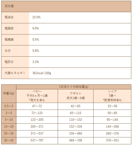 ・画像の給与量表はあくまで目安です。量は年齢、体重、犬種、運動量、環境によって異なります。基本的には愛犬の体調に応じて与えてください。